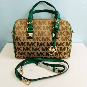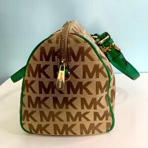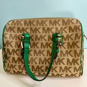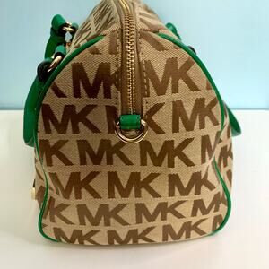 A beautiful satchel purse in signature tan/brown "MK" jacquard. The handles are a contrasting green leather with gold hardware. It has the two satchel handles plus a removable crossbody strap that appears to be new. Gold feet on the bottom and a zipper opening across the top. The clean interior is lined in a tan signature fabric with slide compartments and a zipper pocket. The purse is in excellent condition - no signs of wear or discoloration