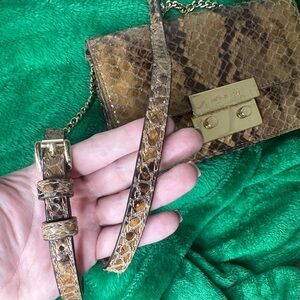 Keywords: Michael Kors, Snake print purse, Python embossed handbag, Designer shoulder bag, Cross Body bag, Brown snake print, Faux snakeskin, Leather handbag, Gold-tone hardware, Top zip closure, Adjustable shoulder strap, Interior pockets, Fully lined, Everyday bag, Evening accessory, Chic fashion statement