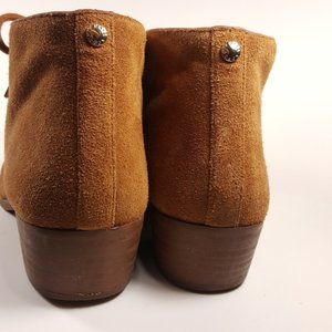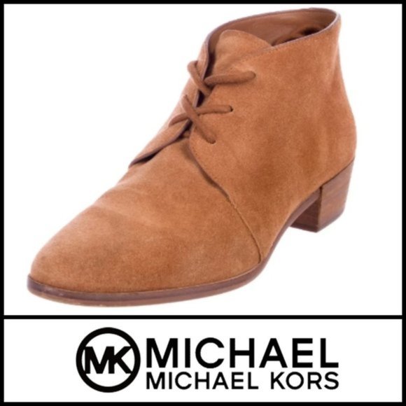 Brown suede Michael Michael Kors round-toe ankle boots with tonal stitching, covered heels and lace-up tie closures. Heels: 1" Excellent condition.