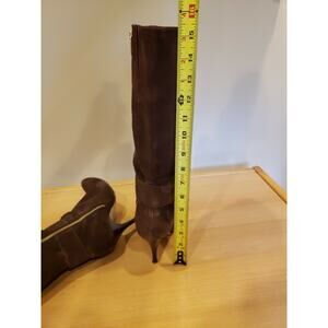 Michael Kors Brown Suede Leather Tall Boots High Heel Gold Emblem. Preowned condition, may need to be treated or cleaned to your preference. Will come as is as shown. Suede has some wear. They do not free stand, I had to hold up. See photos for condition and visual description. If you have any questions please ask 😊