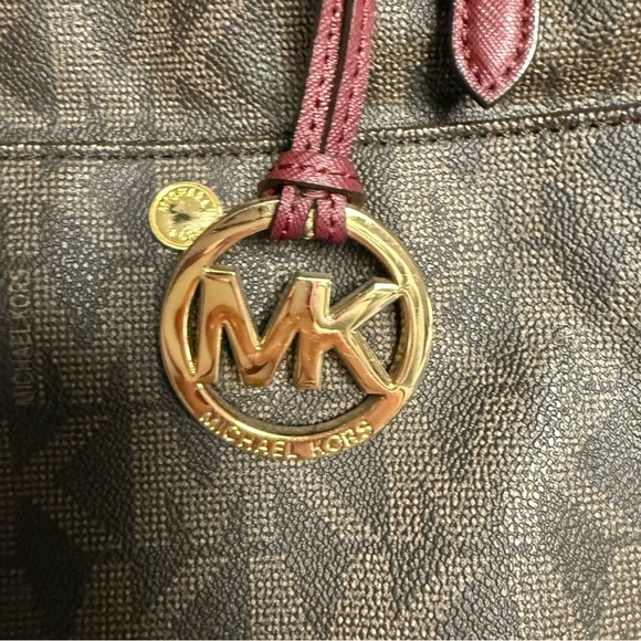 Stylish and versatile, this Michael Kors brown tote bag is perfect for any occasion. Featuring a classic design with ample space, it's a must-have accessory. Burgundy handle and gold accents