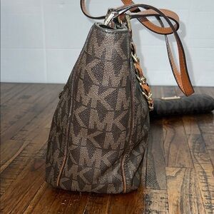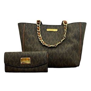 Stylish Michael Kors tote with matching wallet. Features signature MK logo design. Gold-tone hardware.