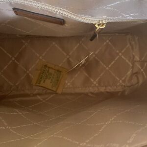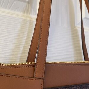 This Michael Kors tote features a stylish structured design in rich brown/Luggage coated canvas with a darker brown monogram pattern. It is equipped with sturdy handles and a gold-toned charm, making it a chic choice for everyday use.