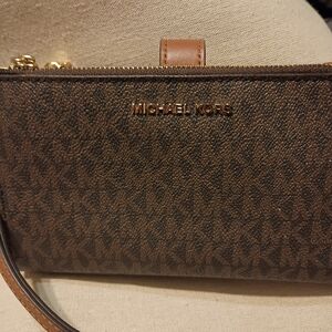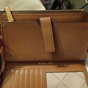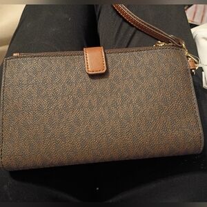 Elegant brown wallet with textured design. Features a secure strap closure. Perfect for everyday use.