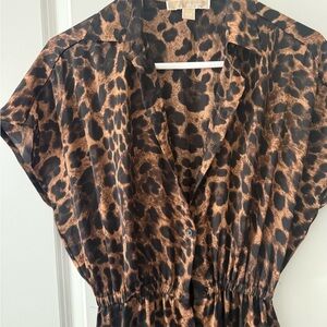 This elegant jumpsuit romper by Michael Kors features a striking brown and black leopard print, perfect for casual or work occasions. The dress boasts a flattering V-neckline and cap dolman sleeves, offering a sophisticated yet relaxed style. Its flowing fabric and notched collar add a touch of elegance to this versatile piece.