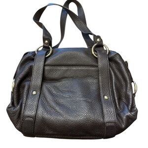 This Michael Kors Fulton satchel bag features dark brown pebbled leather with gold hardware accents. It has double black leather handles, a zip closure, and inner and outer pockets. The medium-sized bag is suitable for various occasions, such as parties, casual outings, formal events, or business use. The design includes a logo accent and a classic, designer theme, making it a stylish and versatile accessory for women.