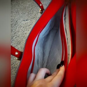 Elegant Michael Kors tote with bold red accents. Features signature logo charm. Ideal for daily use. Features TONS of interior pockets! Middle most pocket is large and padded, perfect for small laptops or tablets!