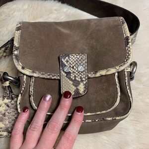 Stylish crossbody bag with a brown base. Features a snake print strap and accents. Perfect for everyday use.