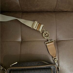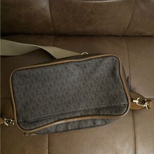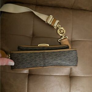 Stylish crossbody bag with signature logo pattern. Features a secure front clasp. Perfect for everyday use.