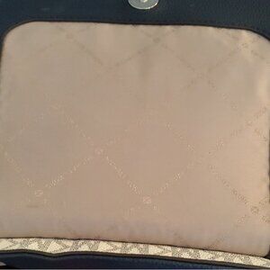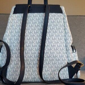 Michael Kors Bucket Backpack in navy blue, and white, with functional silver zippers (+ hardware). 1 front pouch. 2 side pouches. Flap with side-closure. Adjustable straps, and drawstring (located on front). Interior features 2 front slot pockets, and 1 back zipper. In Very Good Condition.