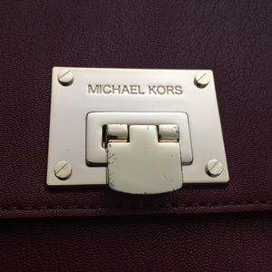 Beautiful burgundy Michael Kors Clutch leather bag with gold details. The 11" drop chain can be used over the shoulder or tucked inside for a Clutch transformation! Interior has card slots along with an additional side slot as well. Dimensions ~ 11.5" x 6.5" x 1.5". Slight scuffs to the gold details as pictured but overall great condition!! Comes with dust bag.