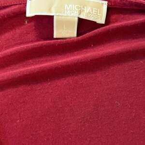 Michael Kors burgundy V-neck mixed media blouse with 3/4 sleeves. This top features a flowing silhouette and a subtly layered hemline, offering a sophisticated yet comfortable fit. Perfect for various occasions, from office wear to casual outings. Good pr