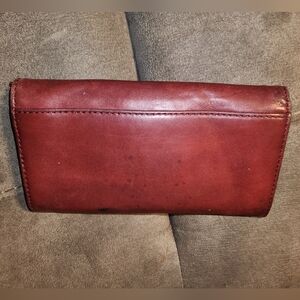 Stylish burgundy wallet with gold logo accent. Perfect for everyday use.
