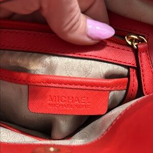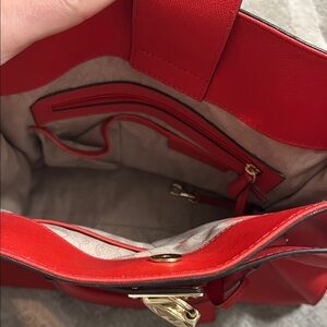 The Michael Kors Burnt Orange and Gold Tote is a perfect blend of style and functionality, featuring a bold red hue and elegant gold-toned hardware. Its structured design and luxurious leather-like texture make it a standout accessory, while the chain strap and top handles offer versatile carrying options.