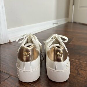 Elegant sneakers with butterfly details. White base with gold accents. Perfect for casual outings.