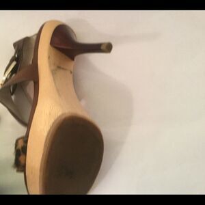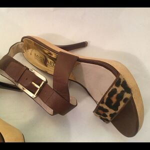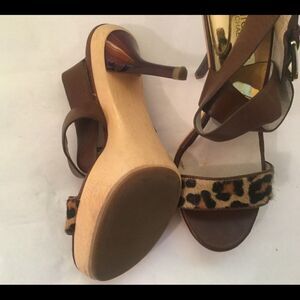 Good preowned condition. Michael Kors Calf Hair Animal Print Leather Wooden Slide Sandals Size 7.5 M