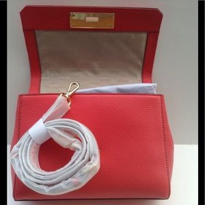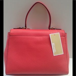Brand new with tags, Authentic Michael Kors Callie Pebbled Leather Satchel in Watermelon. Featuring a flap front closure, goldtone hardware , back slip pocket and removeable 23" shoulder strap. Fully lined in MK signature twill.