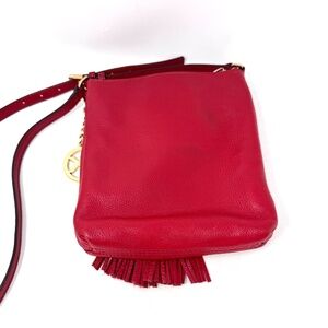 Carry along the classic charm of the MICHAEL Kors camden drawstring Crossbody. This bag is a must have for anyone on the go that wants just that little bit of extra style. Made of pebbled leather upper. Zipper closure. Adjustable crossbody strap. Signature logo medallion. Exterior drawstring pocket with tassels and hardware. Lined interior features two slip pockets. Measurements: Width: 8 in. Depth: 1 in. Height: 10 in. Strap Length: 46 in. Color: Red