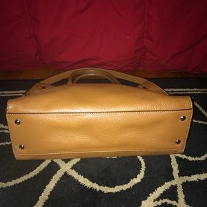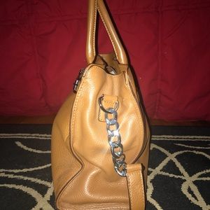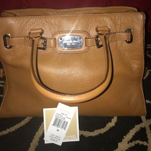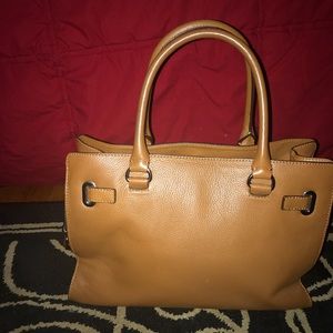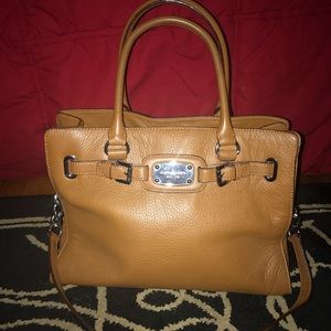 Large Michael Kors Hamilton bag. Barely used (maybe twice) Great condition. Camel with silver hardware. Has shoulder strap as well as handles. Dimensions in inches. 13.5 x 10 x 4( LxHxW)
