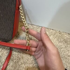 Michael Kors Camera Bag Womens Red Brown Crossbody Purse Gold Chain Trim Stripe