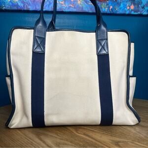 Michael Kors Canvas Leather Trimmed Large Tote Travel Bag Ivory Navy Blue