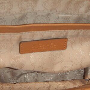 This Michael Kors canvas signature shoulder bag features two outside zip pockets on the front with the MK medallion and two matching drop pockets on the back. The inside has three larger drop pockets and one larger zip pocket. The outside material is in very nice condition with no snags, tare and one small brown stain on bottom front, with the strap showing wear at the top middle portion as seen in photo and spot where the strap is attached to the bag. The bottom is in good condition with only two or three very light marks and the liner has not snags or tares and one small red mark as seen in photo. The bag measures 14"W x 9"T x 5" W