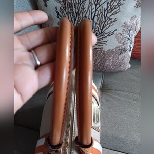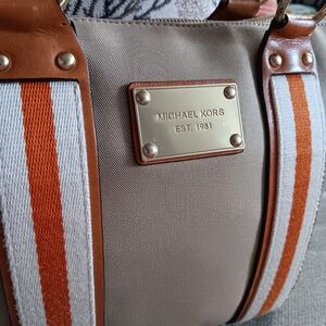 Michael Kora Canvas Varsity Strip Medium Tote. Zip top closure and gold hardware. Clean interior. Nice exterior.
