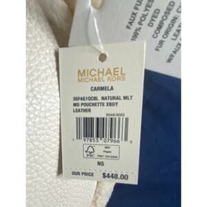 It has a zip closure, lined interior, and includes inner pockets for added organization. The bag also features a fur trim, strap accent, and shearling variation, making it perfect for any occasion from travel to workwear to partying. The Michael Kors Carmela Crossbody is a classic designer bag that will surely turn heads.