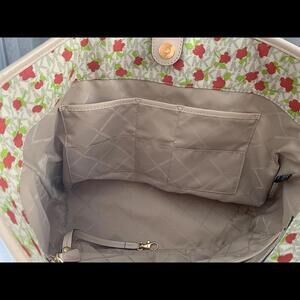 This Michael Kors Carter MK Monogram Rose Floral Vanilla Large Open Tote Bag Purse AB-2012 is a stylish and functional accessory for women. The bag features a beautiful floral pattern, gold hardware, and double handles for easy carrying. It has a snap closure and measures 16-1/2''(L at top) 13''(L at base) with a height of 12'' and a depth of 11''.