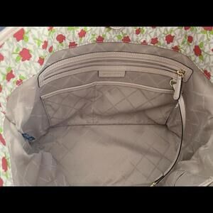 The bag is made of coated leather and has a beige fabric lining with inner pockets for added organization. It comes with a key holder and is perfect for casual occasions. This authentic Michael Kors handbag is part of the Michael Kors Carter product line and has a classic theme.