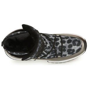 Perfect for city trekking or après-ski lounging, the sport-luxe Cassia boots combine the practicality of snow boots with the athletic ease of a sneaker. They’re made from a tactile combination of cheetah-print nylon and a mirror-metallic material with gripped rubber soles. The cozy lining will keep your feet warm all day long.