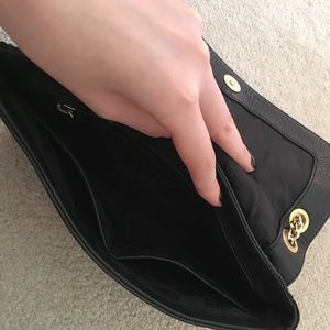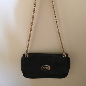 Simple and classic look by Michael Kors. Gold chain strap that can be doubled up for a shorter shoulder bag or longer to hang down lower by your waist for a more elegant look. Soft black leather. Two small inner pockets (for your phone/lipstick/cash) with an extra zip pocket. Logoed interior. Leather is in great condition, small scratch on gold logo plate.