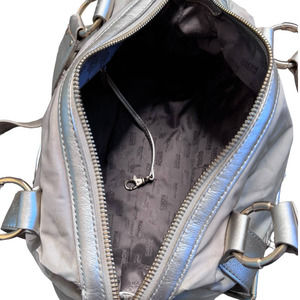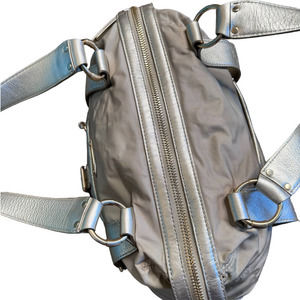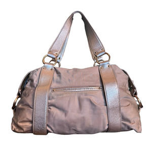 Super cute handbag that looks like a mini duffel bag by Michael Kors. Overall color is a champagne with metallic gold accents. Bag is an easy to wipe nylon style with leather trim. Gold tone hardware. Light use but overall excellent condition. Measurements are approximate. 15"A x 7"H x 6"D Handle drop 8.5"
