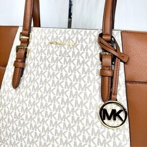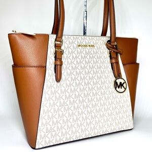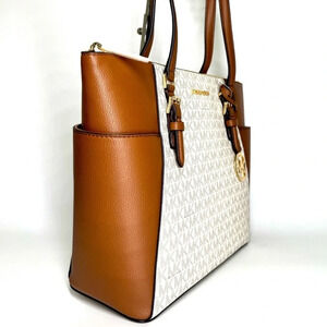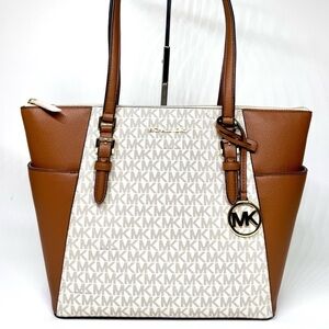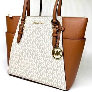 Michael Kors Charlotte Large Leather Top-Zip Tote Bag - Vanilla/Brown