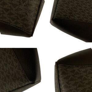 The Michael Kors Grey Monogram and Black Leather Large Tote is a stylish and versatile handbag designed for women. This rectangular-shaped tote features a zip closure, silver hardware, and a black leather handle drop of 10 inches. The bag has a spacious interior lined with black polyester, along with side pockets for added convenience. Made from leather, this large tote from the Michael Kors Charlotte collection combines a sleek grey and black exterior with the signature monogram pattern, making it a chic accessory for any outfit. The included bag charm adds a touch of elegance to this fashionable piece.