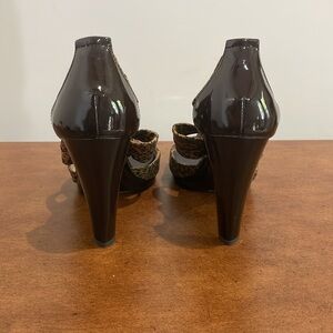 One of my FAVE styles!!! These babies are STUNNING. Beautiful dark oxblood reddish brown patent leather heels and front t-strap with gold zipper hardware. Stretchy leopard print fabric cross-straps...beautiful colors, and such a unique and eye-catching shoe! Approximate heel height 4 inches.