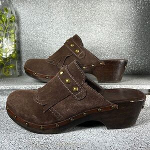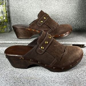 Elegant chocolate suede clogs. Adorned with brass studs. Features a sturdy wooden heel.