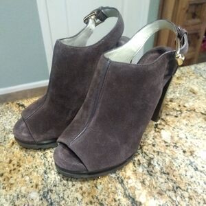 Michael Kors Chunky High Heels Brown Suede Leather Buckle Back Mules Womens 8