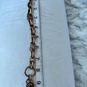 This authentic Michael Kors rose gold-tone chain bracelet features bold oversized links, two signature MK cutout charms, and a classic toggle-bar closure. It’s weighty, shiny, and unmistakably MK — the kind of piece that instantly elevates a simple tee or adds polish to a night-out look.