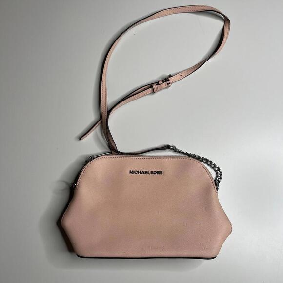 Authentic Michael Kors “Cindy” large dome crossbody bag in ballet pink saffiano leather with silver-tone hardware and chain detail. Features adjustable strap, zip closure, and logo-printed interior with zip and slip pockets.