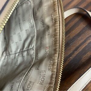 Elevate your style with this stunning Michael Kors Cindy Large Dome Satchel in Oyster Color. Crafted from premium quality leather, this satchel features a zip closure and gold hardware that adds a touch of sophistication to your look. The spacious interior is perfect for storing your essentials and comes with inner pockets for easy organization.