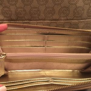 Michael Kors circle logo Grayson satchel. Gold hardware. Gently used. Slight wear to piping on bottom of bag. Top zip closure. Four interior cellphone/multifunctional pockets. One interior zip pocket. Linen interior. MK zipper wallet. Gold hardware. Logo plate. Gold interior. Eight credit card spots. Interior zipper for change.