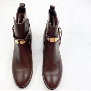 Michael Kors Brown Classic Arley Leather Ankle Boots. Brown leather with Golden Hardware. Round Toe. Buckled Strap Wraps Around Ankle; Logo-Engraved Plate on Front. 1" Heel. Super Cute & Comfy. NWT / New With Tags. No Stains or Rips.