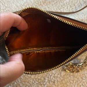 Elegant brown clutch with signature monogram. Features a stylish chain detail. Ideal for evening outings.