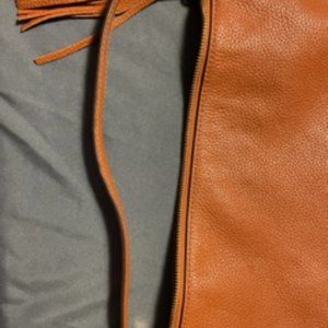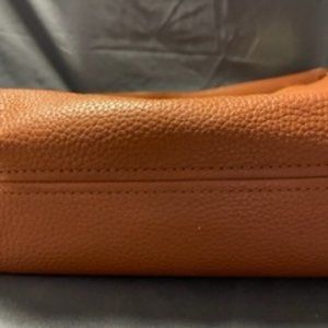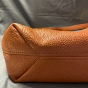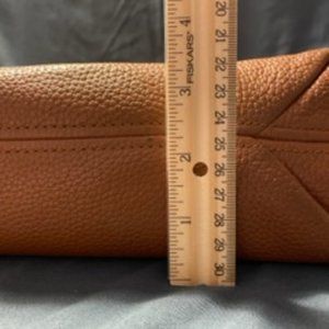 This is an amazing bag! Cognac color goes with any outfit. The bag closure is a zipper with a cute tassel attached. Inside are 4 small pockets and a larger pocket that can be zipped closed. It measures 13" x 12 1/2" x 3". Anything will fit in this bag to make running errands easy.