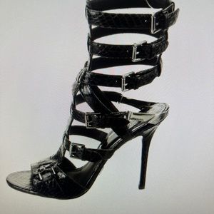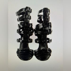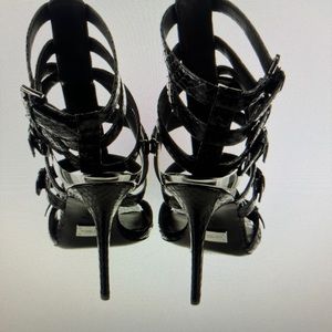 Michael Kors Collection black snakeskin strappy sandals with silver heel accent with MK branding, each shoe comes with its own dust bag