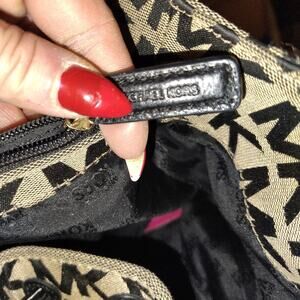 Stylish shoulder bag with iconic MK logo. Features black leather accents and gold hardware. Perfect for everyday use.