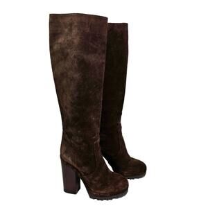 Very hard to find chocolate brown suede knee high heeled boots from Michael Kors Collection which is his high end label. Size 37 which is a size 7 US. Slight scuffs and light signs of wear but overall excellent condition, only worn twice. Heel height measures 4.5" with a platform of 1"
