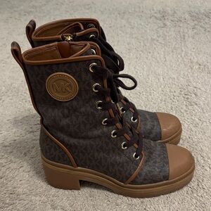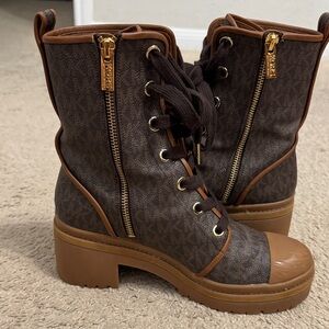 Sophisticated lace-up boots with a stylish design. Features a blend of brown and black tones. Ideal for versatile wear. Almost brand new only wore a few times.