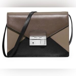 This is a beautiful Michael Kors Collection Gia Medium Tricolor Crossbody Bag, in elephant Elephant color scheme. Michael Kors tricolor palm French calfskin shoulder bag. Removable crossbody strap, as can be used as a clutch. Envelope flap top with push-lock logo clasp and lock. Inside: one zipper pocket and one wall slip in pocket. Back full slip in pocket. Snap adjustable crossbody strap. Minor scuffs from normal wear, overall excellent condition. Full suede interior. 9.5” x 7” x 2.75”. No odors. No tears. No stains.
